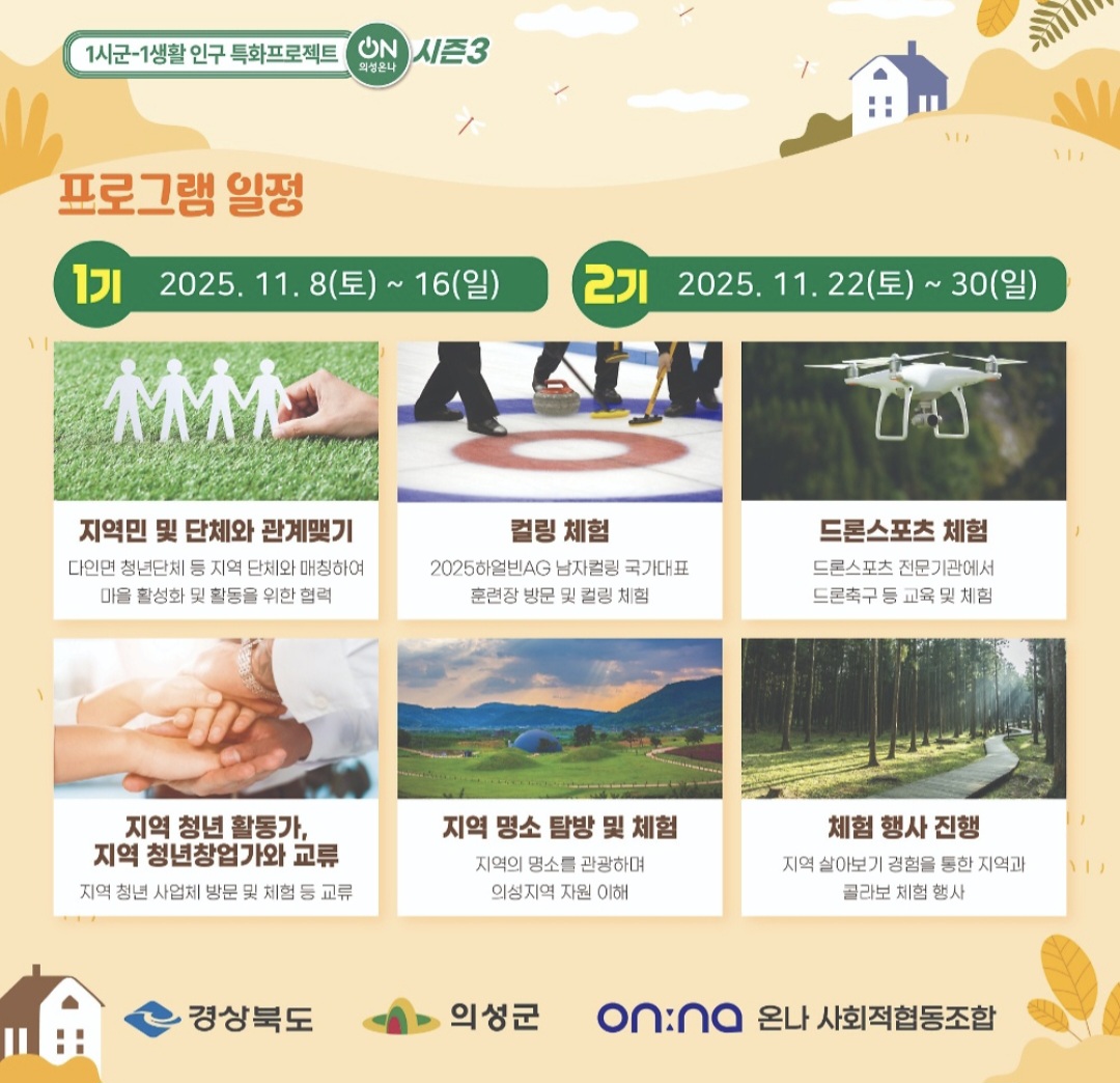 의성온나 시즌3는 경상북도의 '1시군-1생활인구 특화 프로젝트'의 일환으로 선정된 사업이에요. 단순히 관광객을 유치하는 것이 아니라, 일정 기간 지역에 머물며 의성의 매력을 체험할 수 있는 관계인구 형성을 목표로 하고 있죠.