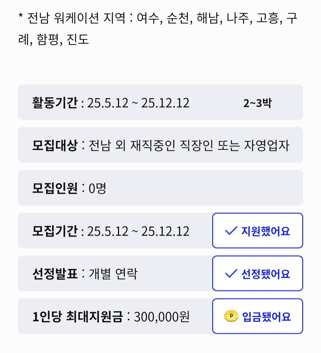 - 패키지(숙박 + 업무 공간 + 체험 포함)로 제공될 때 지원액이 커지는 경향이 있습니다.