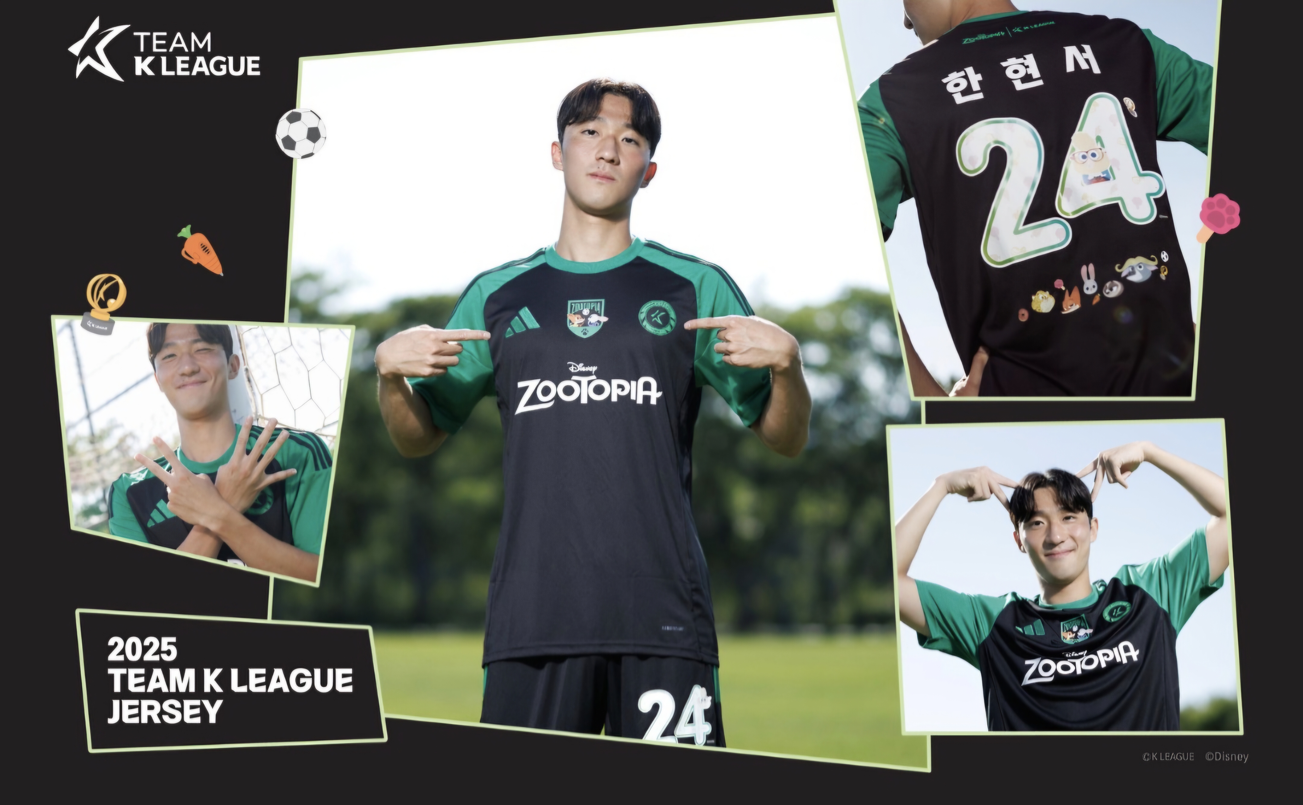 이번 2025 쿠팡플레이 시리즈를 위해 특별 제작된 팀 K리그 유니폼은 정말 특별해요. 검은색 바탕에 주토피아의 상징인 초록색을 포인트로 사용했거든요. K리그, 디즈니코리아, 아디다스가 머리를 맞대고 디자인한 이 유니폼은 상의 상단에 주토피아와 K리그의 공동 로고가 새겨져 있어요.